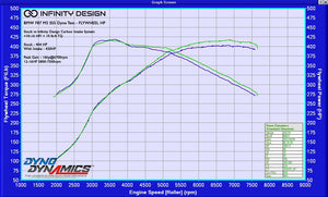 Average Peak Gains - 15WHP @ 6700rpm12-15WHP 5800-7500rpm.  The results are as expected for a large volume system with ​large velocity stack shaped inlet tubes.  The OEM system flows enough up to 4000rpm up to which there are small gains in power.  After 4000rpm, power gradually increases to the rpm limiter with 12-16 flywheel HP from 5800-7500rpm.The Maximum Delta gains from the average stock run vs the highest run with the carbon intakes is also displayed on the third graph.  While this is a real result we do not quote this HP gain as part or our marketing. This gain is possible however.  The gains are realistic as the power increases from 3000rpm onwards with no gain below this.  The graphs are not a phase shift which is typical of dyno tests where the correction factor has been changed to show larger than actual gains for marketing purposes.