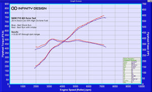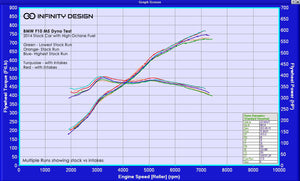 Below is a further set of results showing the other dyno runs with the stock intake and Infinity intake.The F10 M5 is very sensitive on the dyno and can produce results which vary. Due to the S63TU engine being turbocharged, the charge temperatures can rise dramatically between runs. The engine management system will apply it's compensation tables for increased charge, coolant and oil temperatures. Companies, their dealers and sponsors take advantage of this and show the lowest stock runs vs the highest runs with a modification fitted in order to exaggerate the gains for marketing and sales purposes.We are very much against showing these unrealistic gains as this is highly misleading.Below shows the results of multiple runs of the stock setup vs Infinity intakes fitted. If the lowest stock runs were used in our official results then a gain of approximately 35-40 hp could be shown which is not realistic of any intake system.