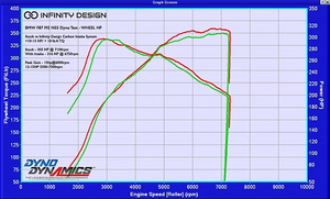 Dyno tests were performed under strict controlled conditions on a Dyno Dynamics machine in order to show a true and realistic result.Directly inline with the on-road driving experience and a very realistic result. Engine produces more torque initially which is directly related to the improved flow characteristics of the inlet tube allowing the turbo to spool up faster. No gain expected in the midrange as the stock intake system flows enough in this region. After 4900rpm the power gain increases all the way to redline. It's important to point out that fabricated dyno graphs tend to show a similar dyno curve shape but just higher across the rpm range. Here we can see the two graphs are almost exactly the same from 2800-4900rpm and the gains are at the higher rpm where the stock system becomes a restriction. These are wheel horsepower results. Flywheel estimation would be a realistic + 16-18HP.