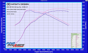 Average Peak Gains - 15WHP @ 6700rpm12-15WHP 5800-7500rpm. The results are as expected for a large volume system with large velocity stack shaped inlet tubes. The OEM system flows enough up to 4000rpm up to which there are small gains in power. After 4000rpm, power gradually increases to the rpm limiter with 12-16 flywheel HP from 5800-7500rpm.The Maximum Delta gains from the average stock run vs the highest run with the carbon intakes is also displayed on the third graph. While this is a real result we do not quote this HP gain as part or our marketing. This gain is possible however. The gains are realistic as the power increases from 3000rpm onwards with no gain below this. The graphs are not a phase shift which is typical of dyno tests where the correction factor has been changed to show larger than actual gains for marketing purposes.