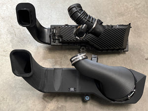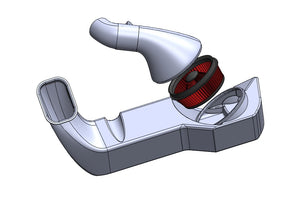 The air filter sits inside a large volume sealed airbox with a larger snorkel / air intake. In comparison to the OEM airbox and inlet tube, our design is significantly larger in volume. Our inlet tube is effectively a very large velocity stack. This in effect aids in creating a much more effective venturi effect in addition to a much smoother path for the air to flow.