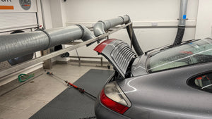 The dyno cell comprised of three very large fans at the front and three large fans at the rear for extraction. In addition to those, a special cage with downward facing fans were placed over the rear of the 911.