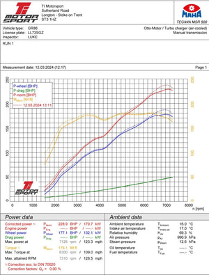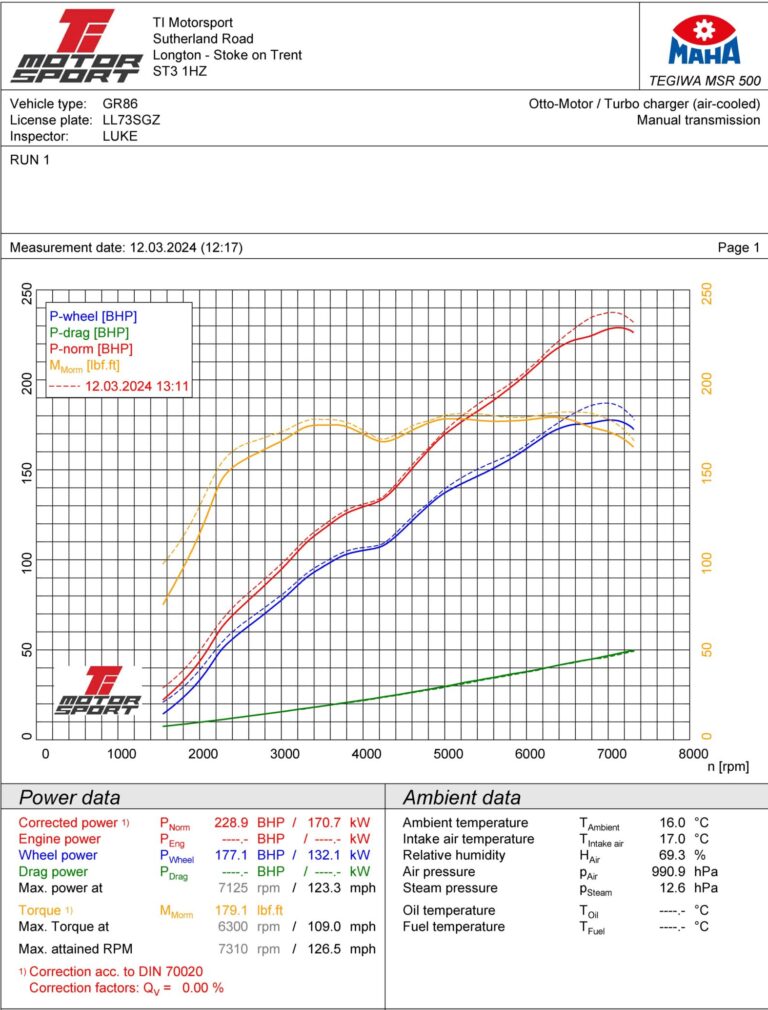 The stock car made almost exactly what the manufacturer quotes with 228 BHP and 179 lb.ft torque with a perfect power curve.